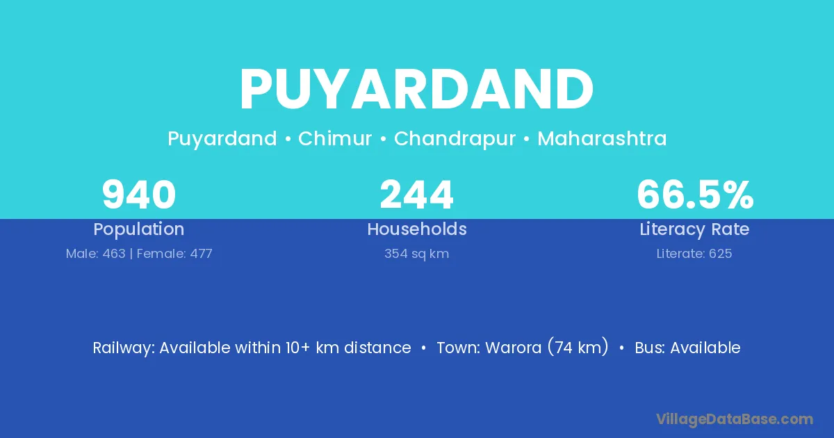 Warora (74 km) is the nearest town to Puyardand village for major economic activities and is located approximately 74 km away.