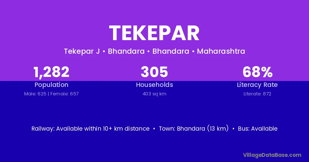 Warora (45 km) is the nearest town to Tekepar village for major economic activities and is located approximately 45 km away.