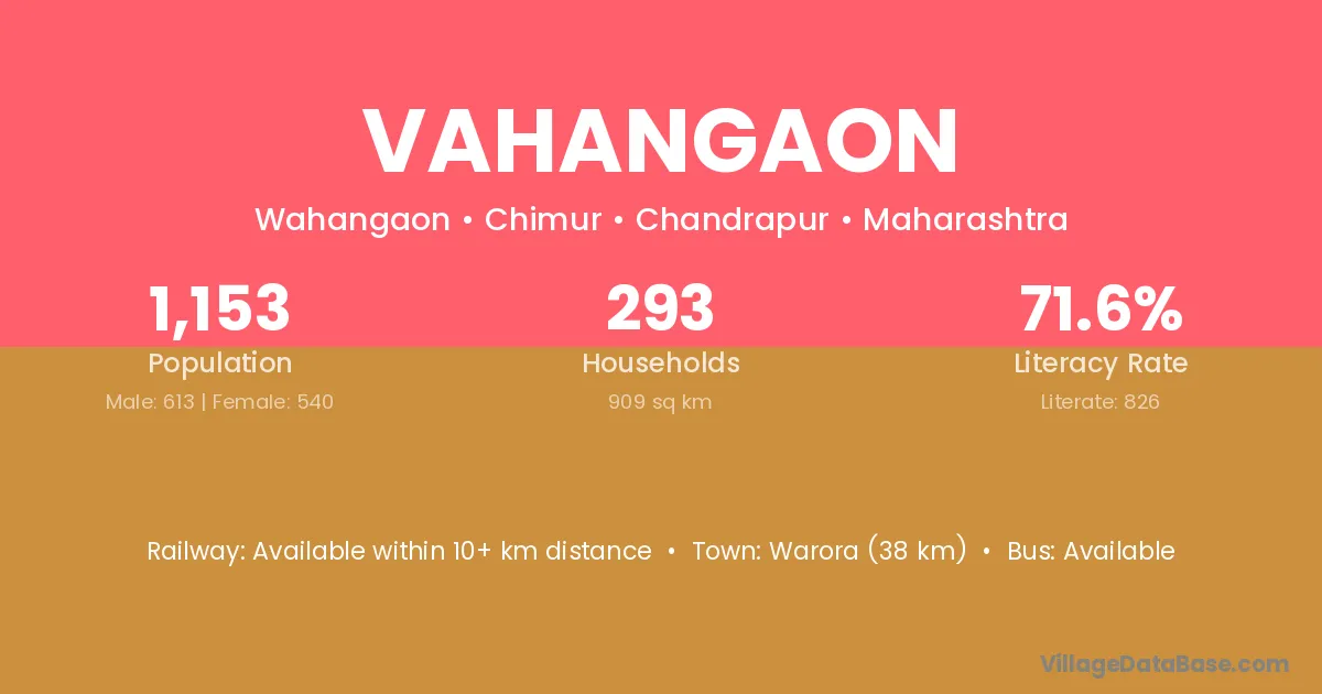 Warora (38 km) is the nearest town to Vahangaon village for major economic activities and is located approximately 38 km away.