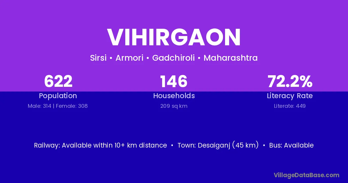 Warora (85 km) is the nearest town to Vihirgaon village for major economic activities and is located approximately 85 km away.