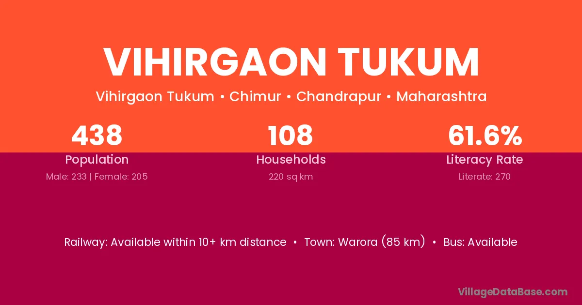 Warora (85 km) is the nearest town to Vihirgaon Tukum village for major economic activities and is located approximately 85 km away.