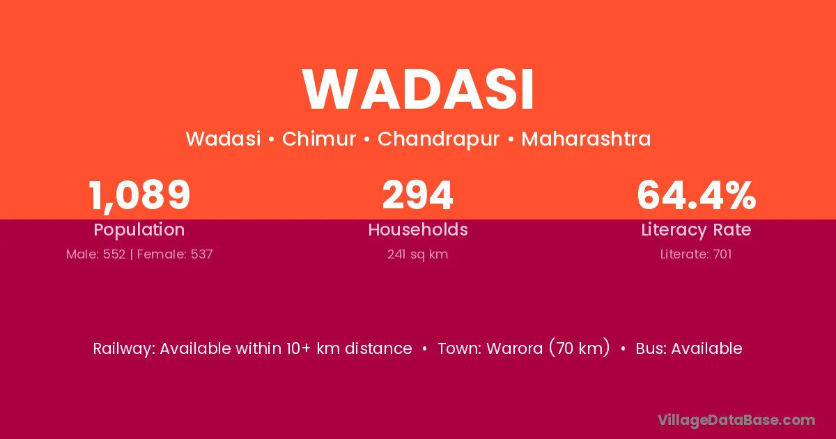 Warora (70 km) is the nearest town to Wadasi village for major economic activities and is located approximately 70 km away.