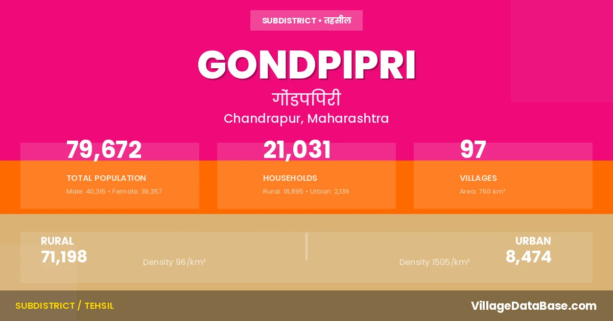 According to the 2011 census The total area of Gondpipri Tehsil is 750 km², with a population of 79672 people. The population density is 106 inhabitants per square kilometre, and there are approximately 21031 houses in the sub district.