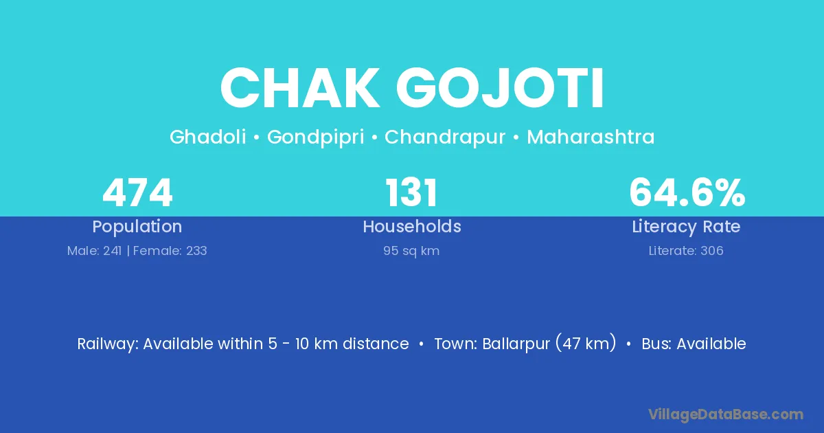 Ballarpur (47 km) is the nearest town to Chak Gojoti village for major economic activities and is located approximately 47 km away.