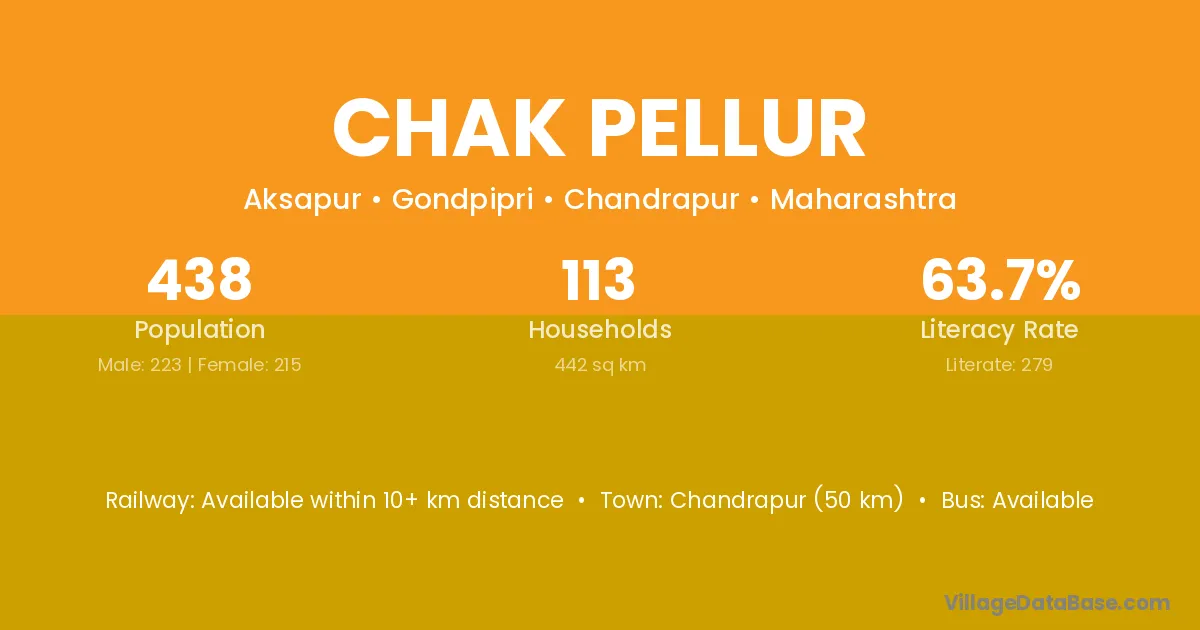 Chandrapur (50 km) is the nearest town to Chak Pellur village for major economic activities and is located approximately 50 km away.