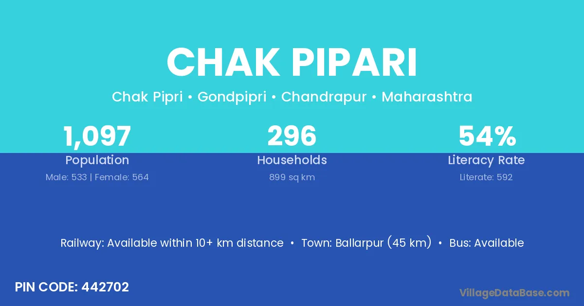 Ballarpur (45 km) is the nearest town to Chak Pipari village for major economic activities and is located approximately 45 km away.