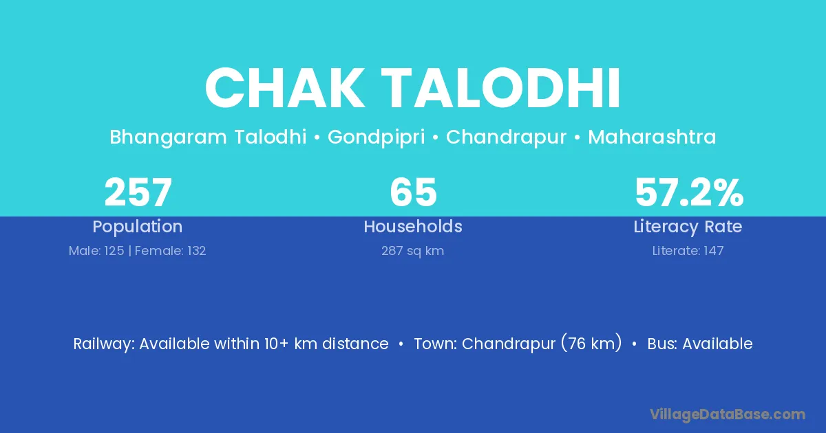 Chandrapur (76 km) is the nearest town to Chak Talodhi village for major economic activities and is located approximately 76 km away.