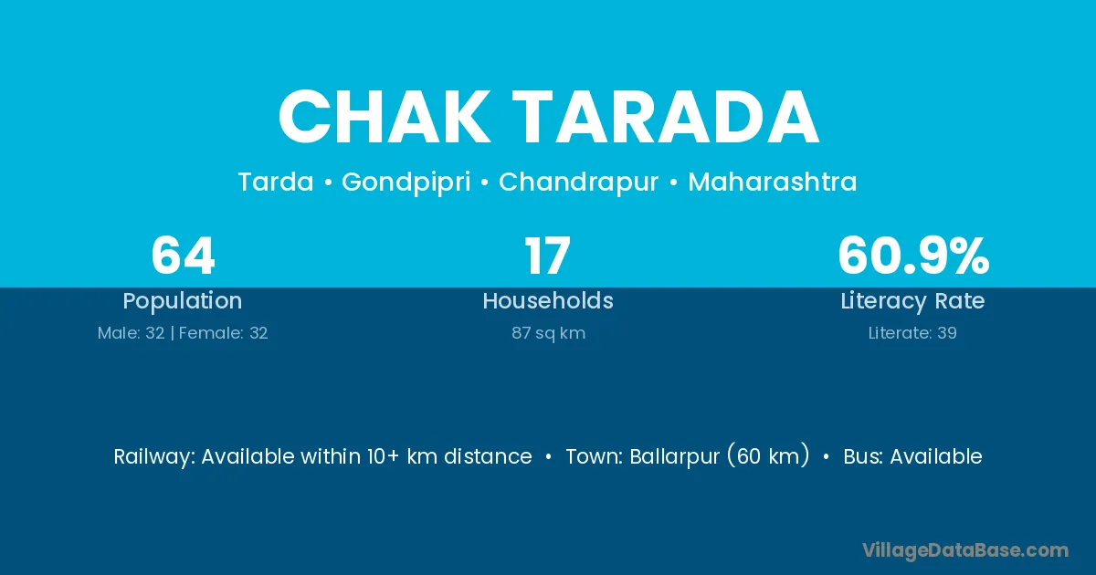 Ballarpur (60 km) is the nearest town to Chak Tarada village for major economic activities and is located approximately 60 km away.