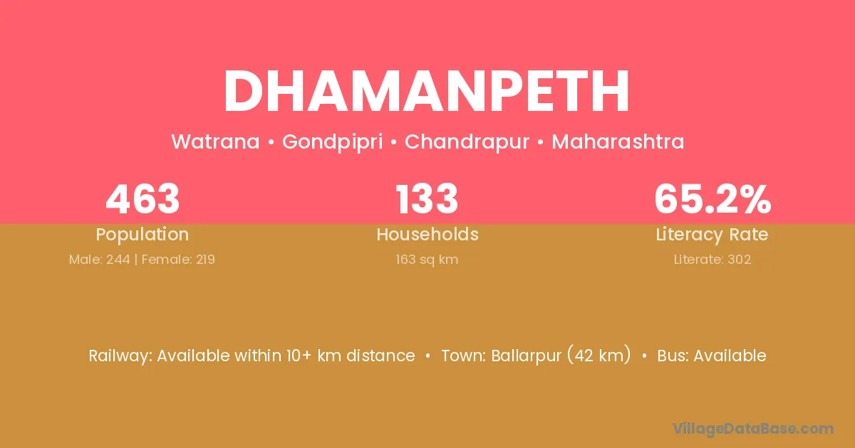 Ballarpur (42 km) is the nearest town to Dhamanpeth village for major economic activities and is located approximately 42 km away.
