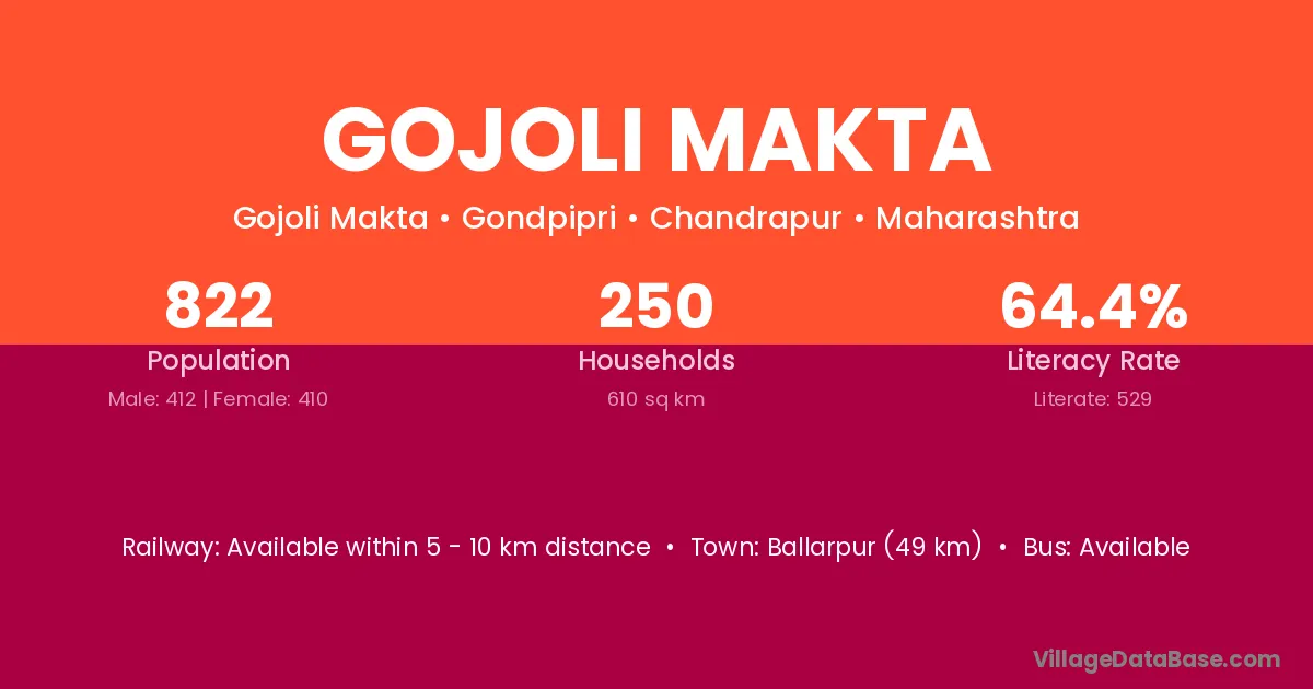 Ballarpur (49 km) is the nearest town to Gojoli Makta village for major economic activities and is located approximately 49 km away.