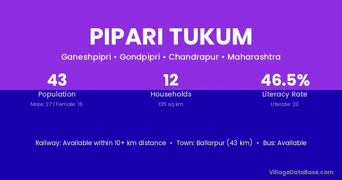 Ballarpur (43 km) is the nearest town to Pipari Tukum village for major economic activities and is located approximately 43 km away.