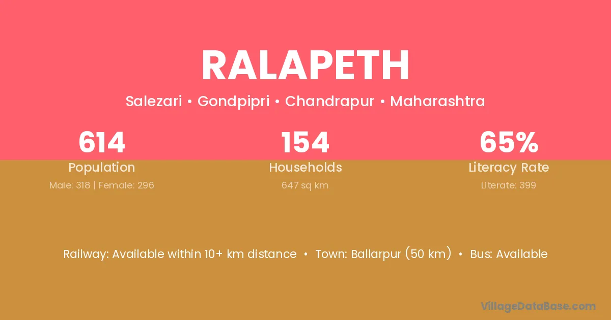 Ballarpur (50 km) is the nearest town to Ralapeth village for major economic activities and is located approximately 50 km away.