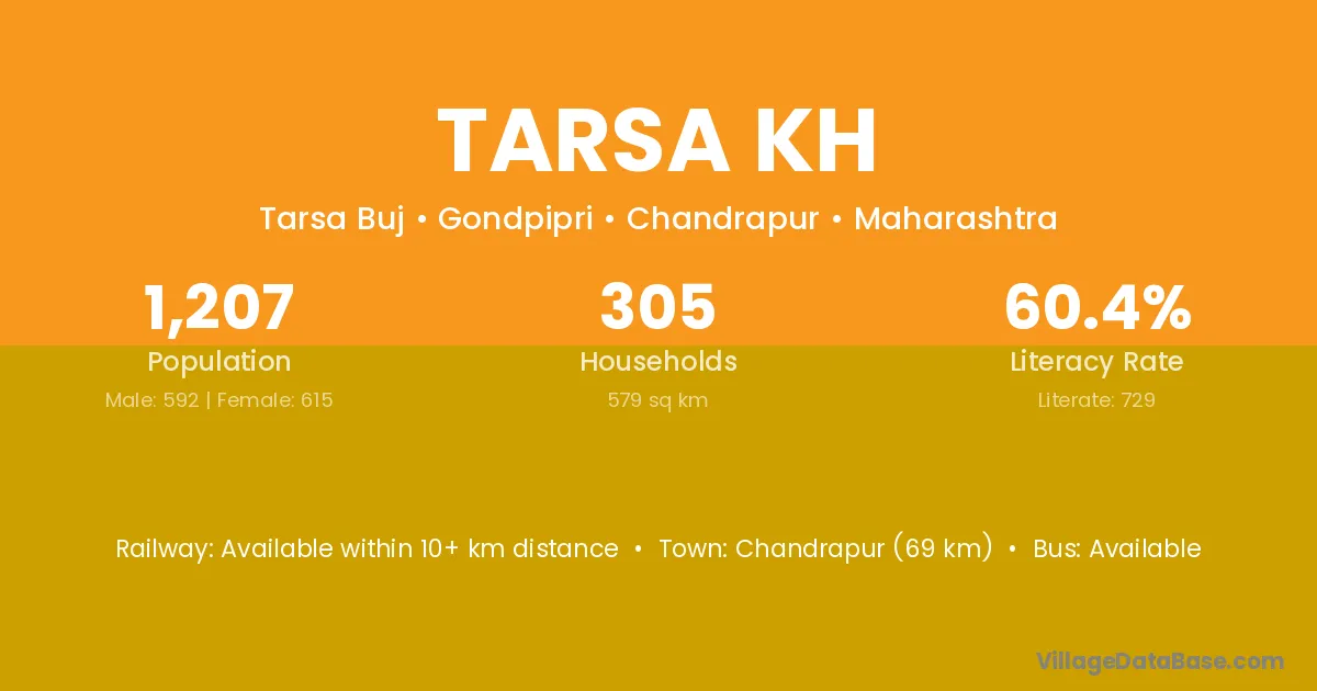 Chandrapur (69 km) is the nearest town to Tarsa Kh village for major economic activities and is located approximately 69 km away.