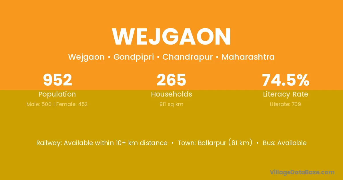 Ballarpur (61 km) is the nearest town to Wejgaon village for major economic activities and is located approximately 61 km away.