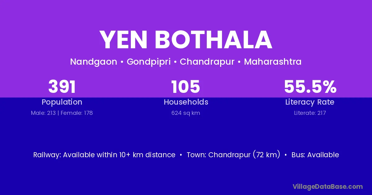 Chandrapur (72 km) is the nearest town to Yen Bothala village for major economic activities and is located approximately 72 km away.
