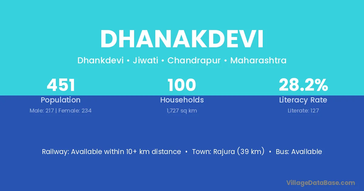 Rajura (39 km) is the nearest town to Dhanakdevi village for major economic activities and is located approximately 39 km away.