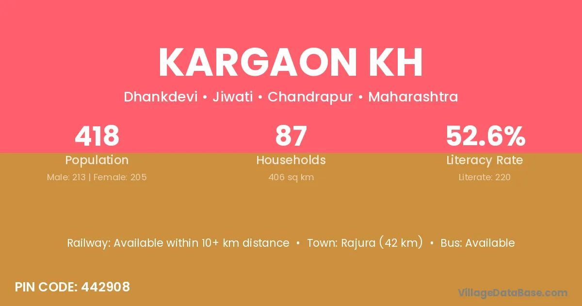 Rajura (42 km) is the nearest town to Kargaon Kh village for major economic activities and is located approximately 42 km away.