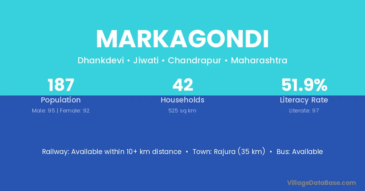 Rajura (35 km) is the nearest town to Markagondi village for major economic activities and is located approximately 35 km away.