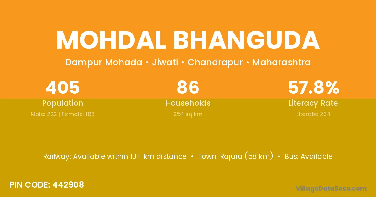 Rajura (58 km) is the nearest town to Mohdal Bhanguda village for major economic activities and is located approximately 58 km away.
