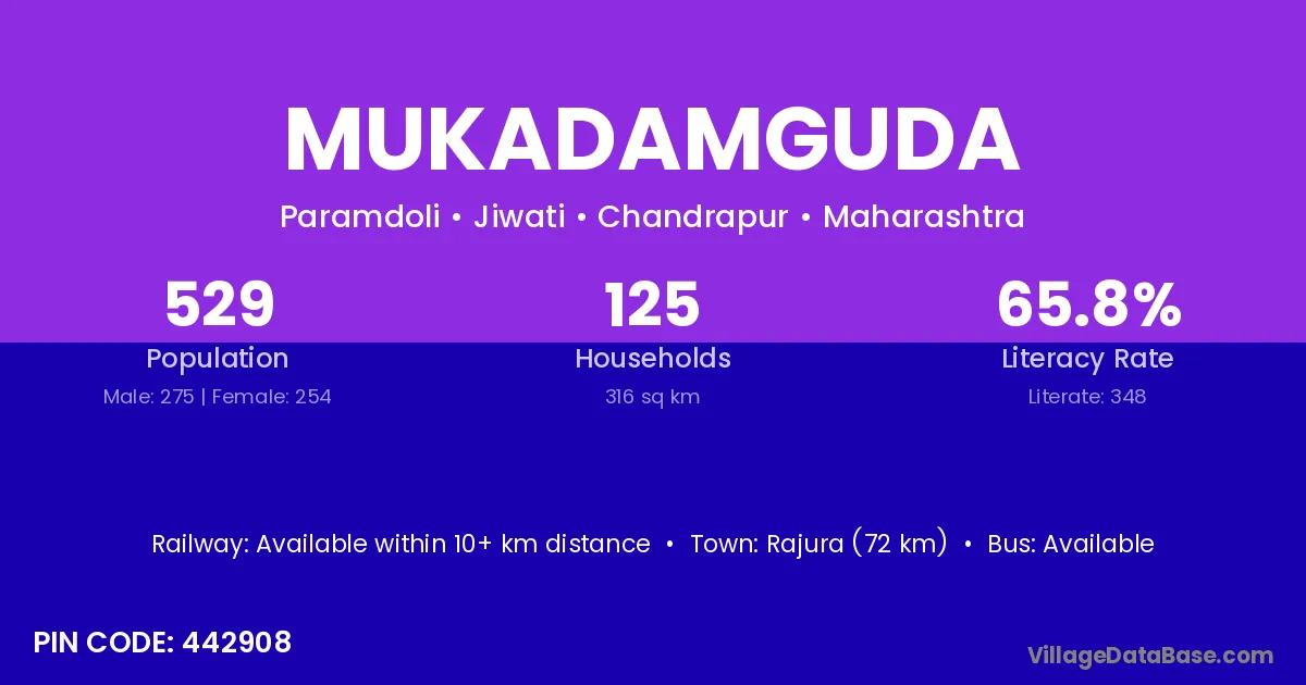 Rajura (72 km) is the nearest town to Mukadamguda village for major economic activities and is located approximately 72 km away.