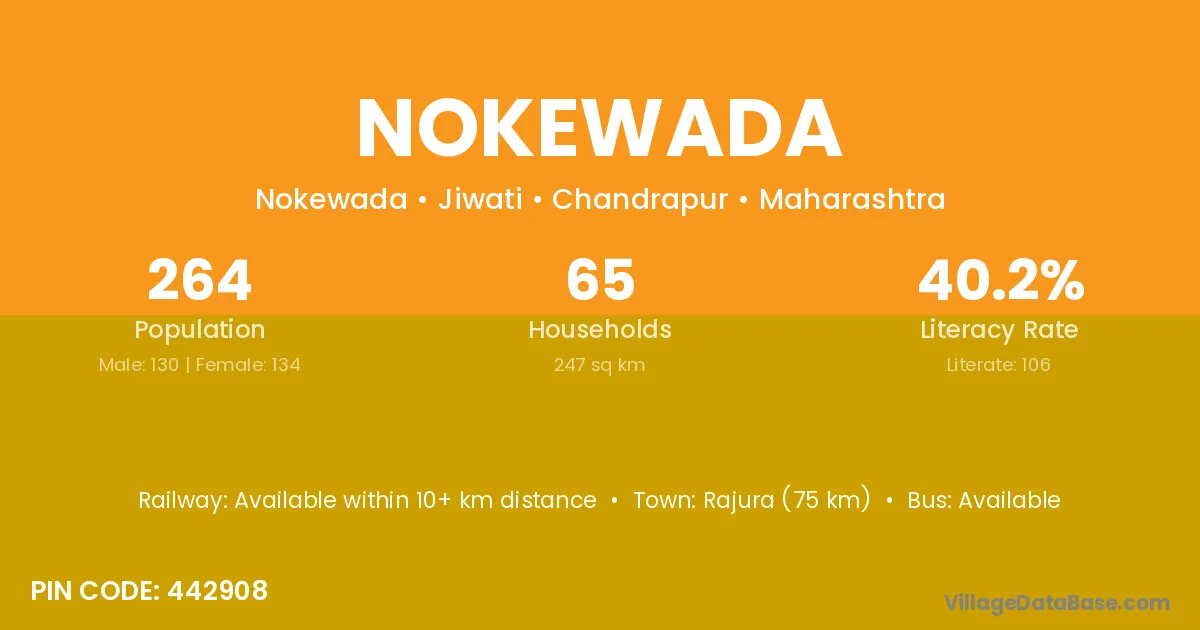 Rajura (75 km) is the nearest town to Nokewada village for major economic activities and is located approximately 75 km away.