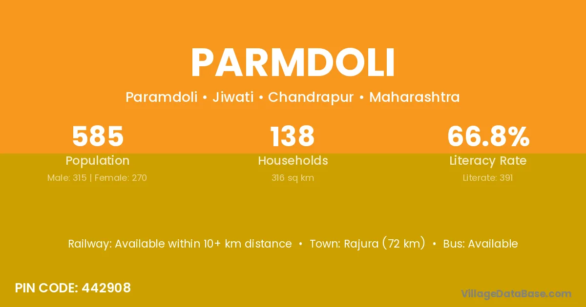Rajura (72 km) is the nearest town to Parmdoli village for major economic activities and is located approximately 72 km away.