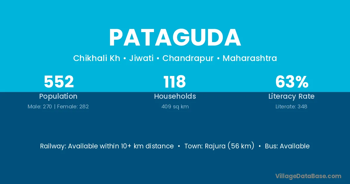 Rajura (56 km) is the nearest town to Pataguda village for major economic activities and is located approximately 56 km away.