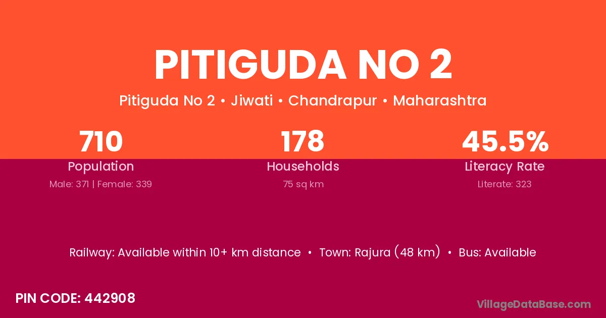 Rajura (48 km) is the nearest town to Pitiguda No 2 village for major economic activities and is located approximately 48 km away.