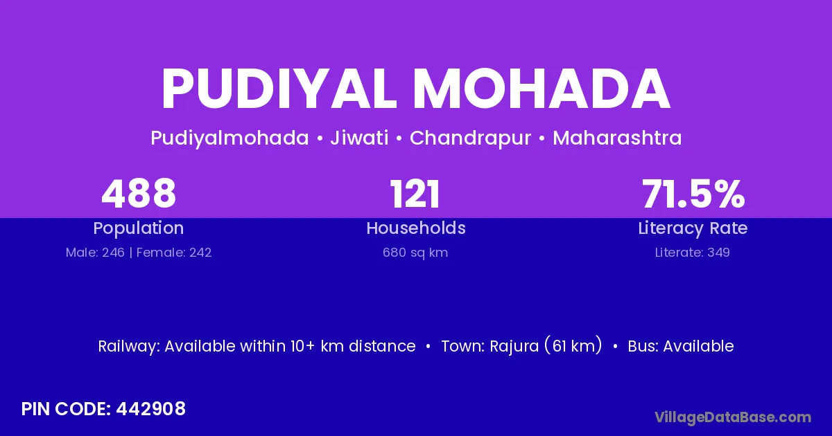 Rajura (61 km) is the nearest town to Pudiyal Mohada village for major economic activities and is located approximately 61 km away.