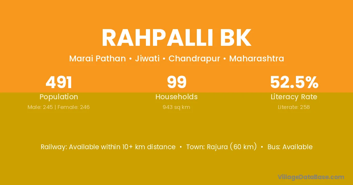 Rajura (60 km) is the nearest town to Rahpalli Bk village for major economic activities and is located approximately 60 km away.