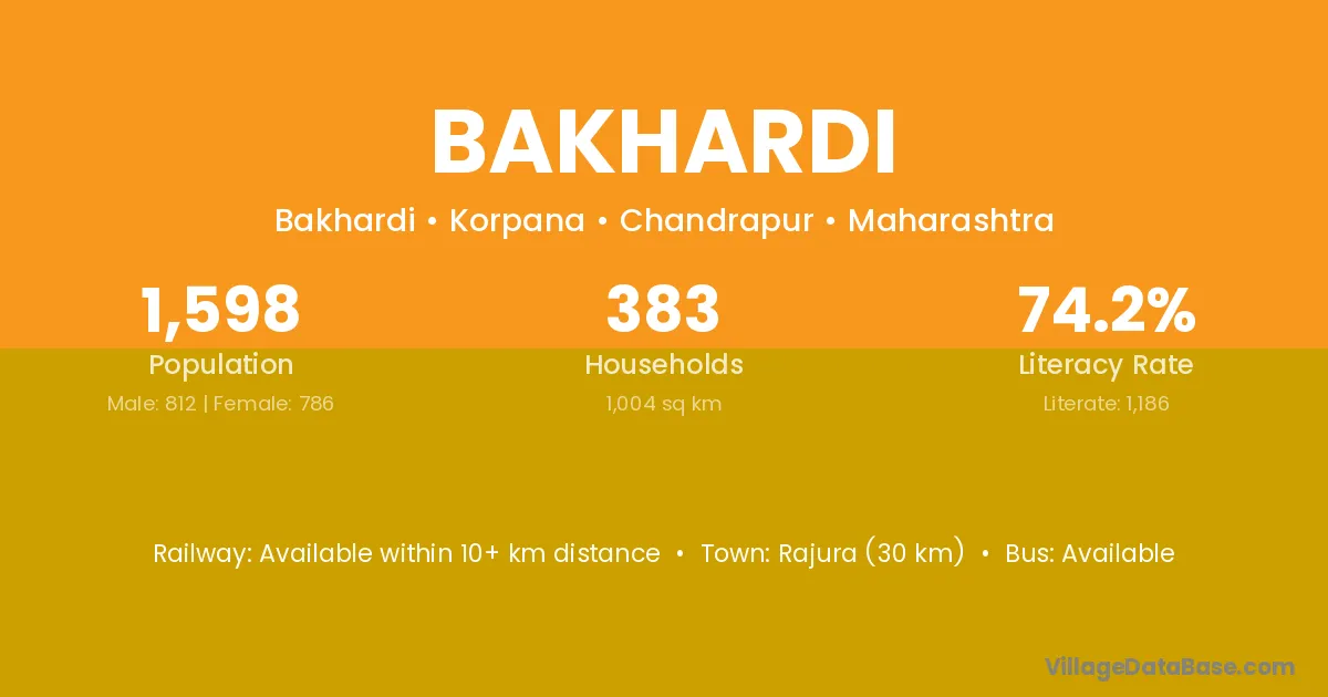 Rajura (30 km) is the nearest town to Bakhardi village for major economic activities and is located approximately 30 km away.