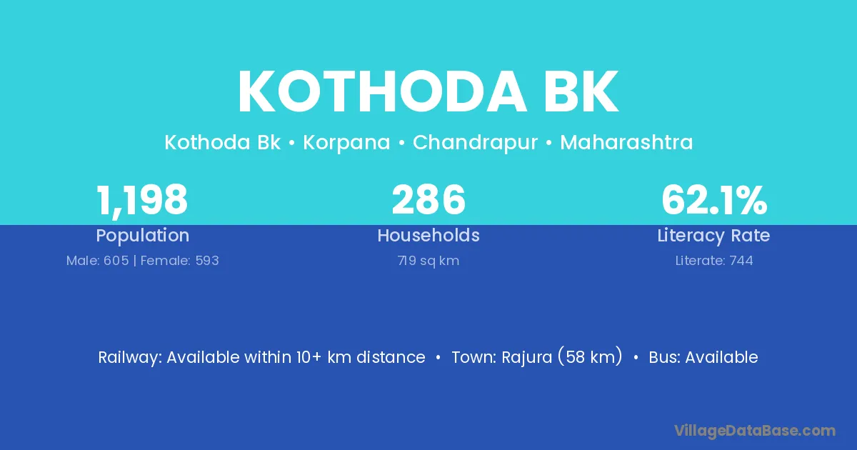 Rajura (58 km) is the nearest town to Kothoda Bk village for major economic activities and is located approximately 58 km away.