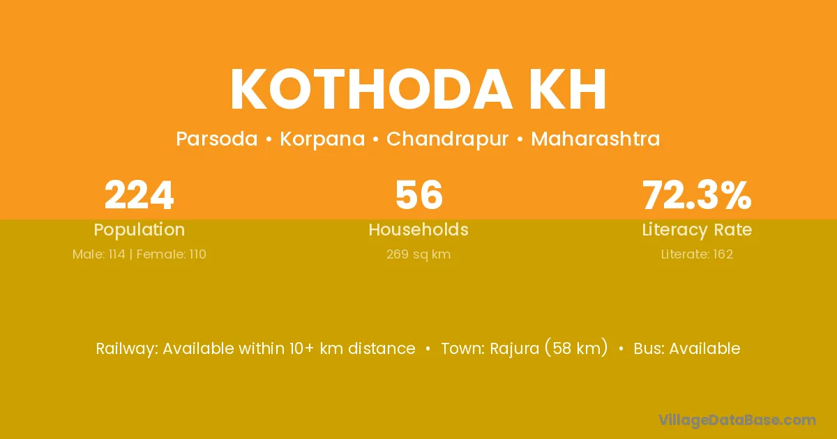 Rajura (58 km) is the nearest town to Kothoda Kh village for major economic activities and is located approximately 58 km away.