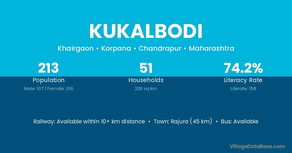Rajura (45 km) is the nearest town to Kukalbodi village for major economic activities and is located approximately 45 km away.
