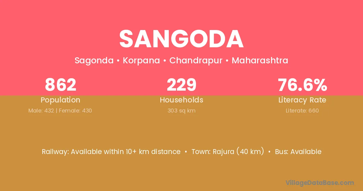 Rajura (40 km) is the nearest town to Sangoda village for major economic activities and is located approximately 40 km away.