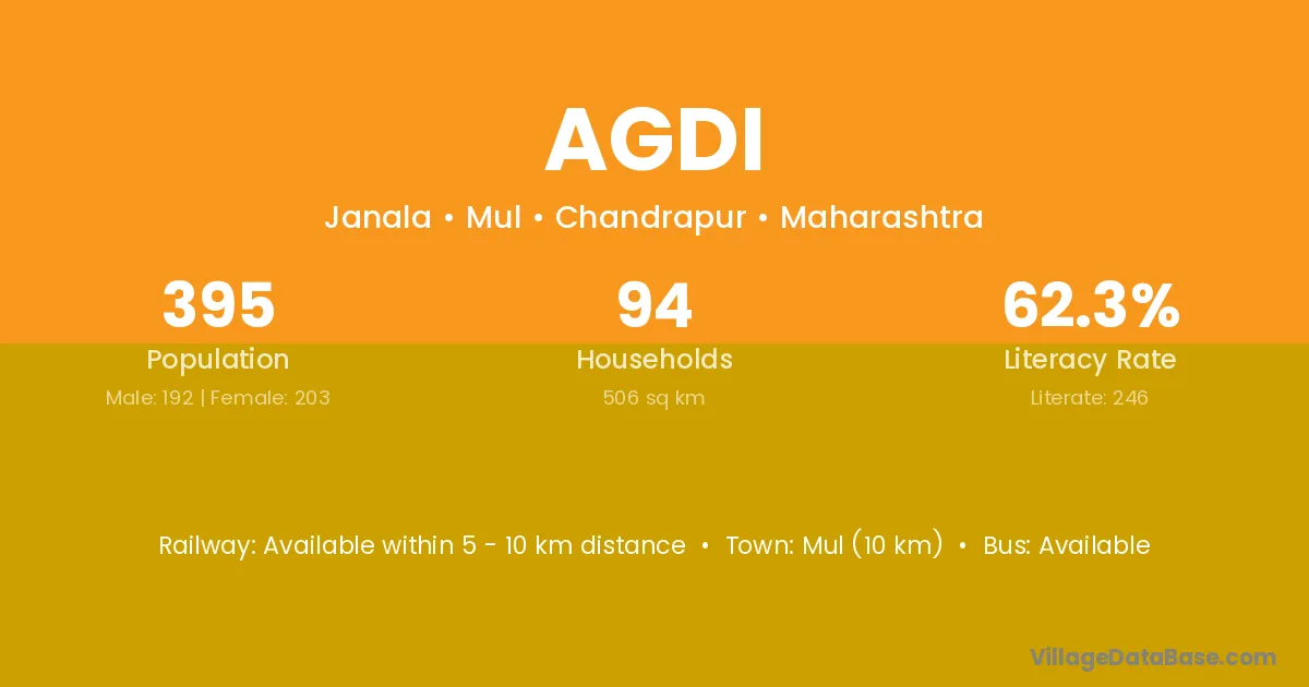 Agdi village has a total population of 395 people, of which 192 are males and 203 are females.