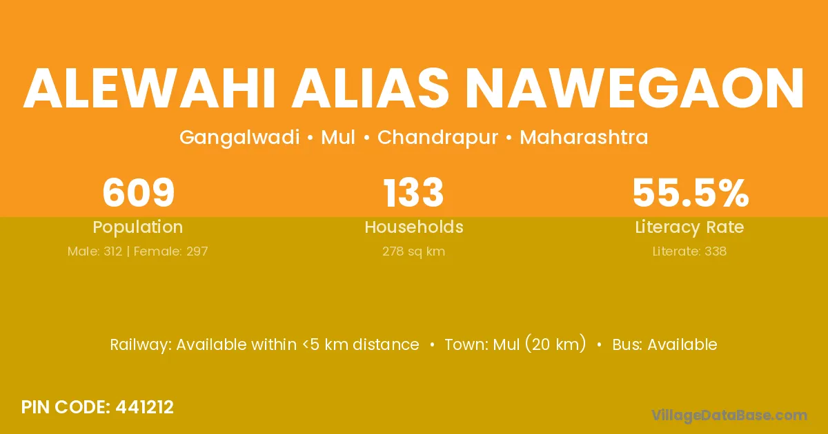 Alewahi Alias Nawegaon village has a total population of 609 people, of which 312 are males and 297 are females.