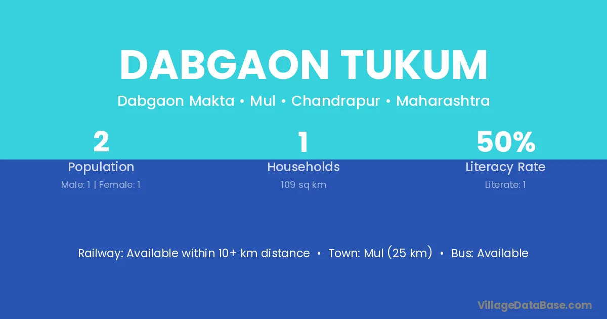 Mul (25 km) is the nearest town to Dabgaon Tukum village for major economic activities and is located approximately 25 km away.