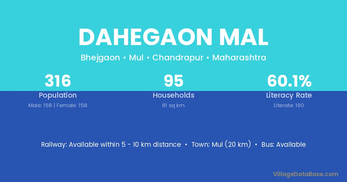 Dahegaon Mal village has a total population of 316 people, of which 158 are males and 158 are females.