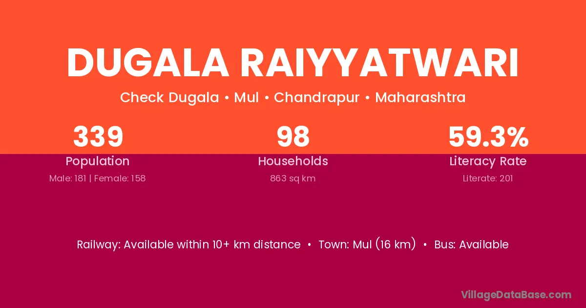 Mul (16 km) is the nearest town to Dugala Raiyyatwari village for major economic activities and is located approximately 16 km away.