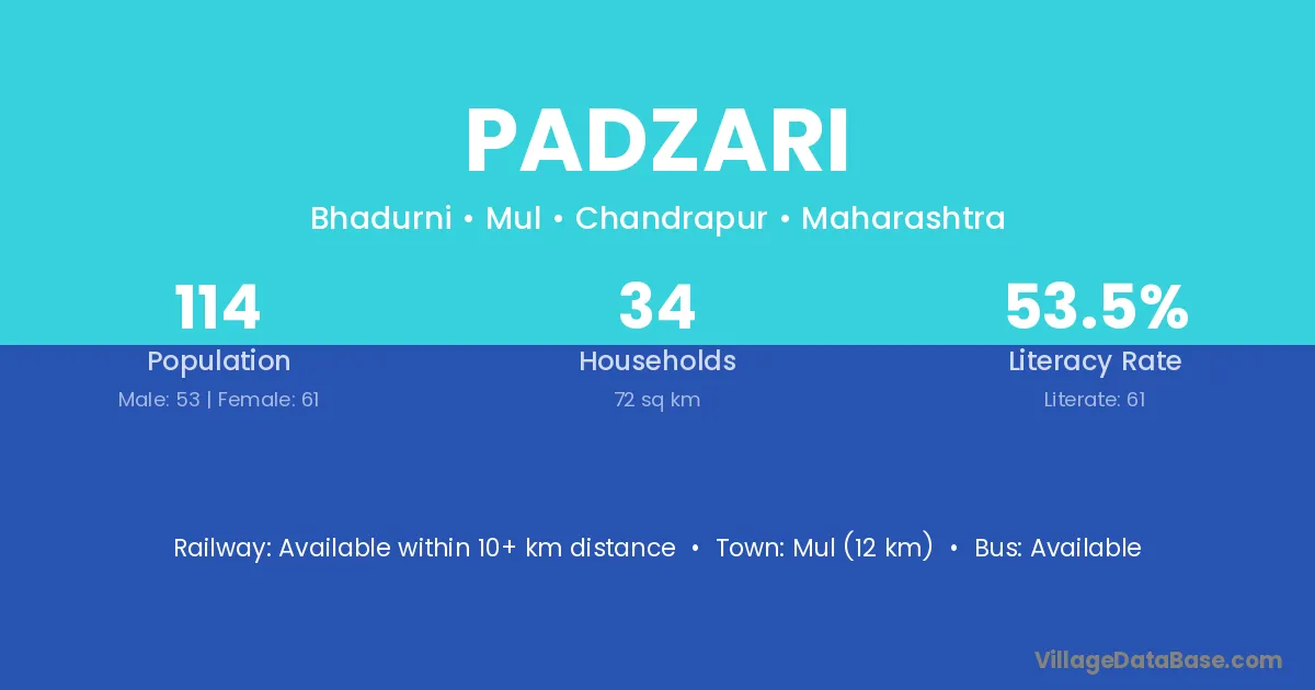 Mul (12 km) is the nearest town to Padzari village for major economic activities and is located approximately 12 km away.
