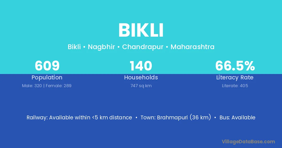 Brahmapuri (36 km) is the nearest town to Bikli village for major economic activities and is located approximately 36 km away.