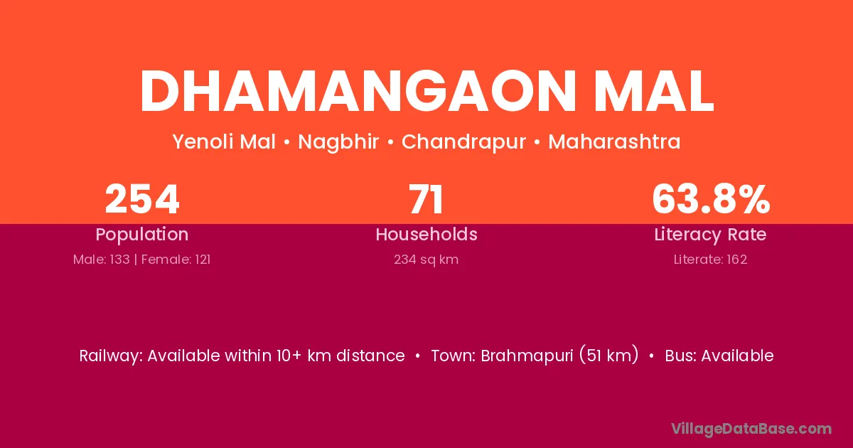 Brahmapuri (51 km) is the nearest town to Dhamangaon Mal village for major economic activities and is located approximately 51 km away.