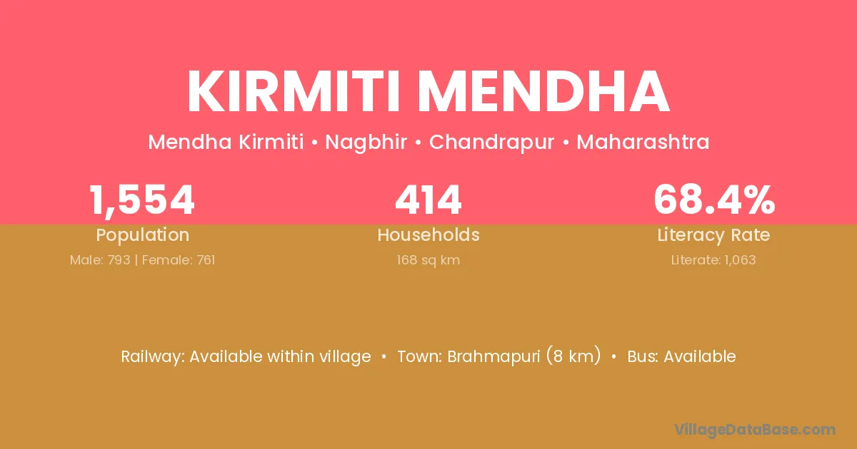 Brahmapuri (8 km) is the nearest town to Kirmiti Mendha village for major economic activities and is located approximately 8 km away.