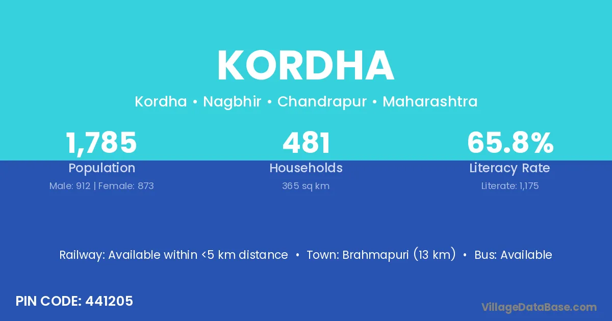 Brahmapuri (13 km) is the nearest town to Kordha village for major economic activities and is located approximately 13 km away.