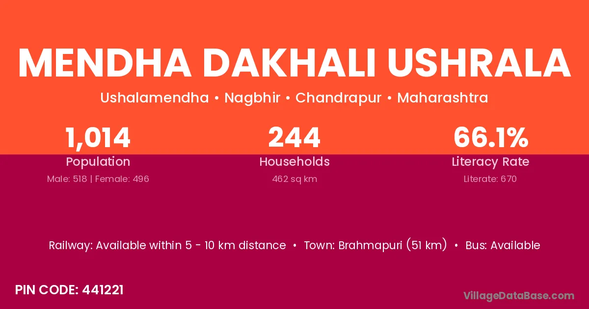 Brahmapuri (51 km) is the nearest town to Mendha Dakhali Ushrala village for major economic activities and is located approximately 51 km away.