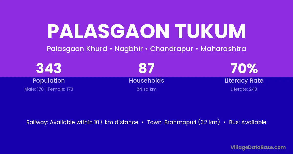 Brahmapuri (32 km) is the nearest town to Palasgaon Tukum village for major economic activities and is located approximately 32 km away.