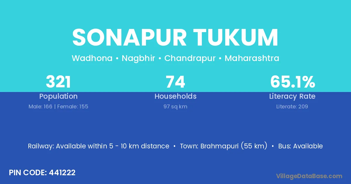 Brahmapuri (55 km) is the nearest town to Sonapur Tukum village for major economic activities and is located approximately 55 km away.