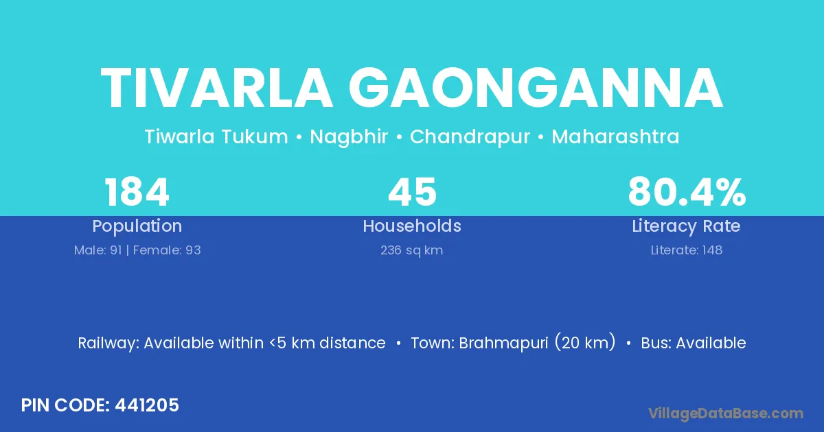 Brahmapuri (20 km) is the nearest town to Tivarla Gaonganna village for major economic activities and is located approximately 20 km away.