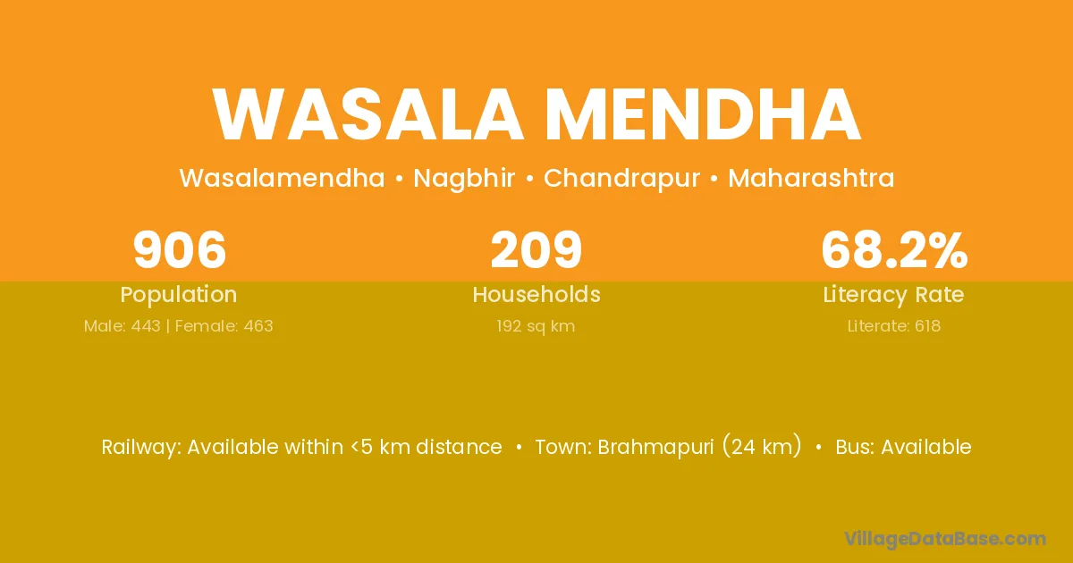 Brahmapuri (24 km) is the nearest town to Wasala Mendha village for major economic activities and is located approximately 24 km away.